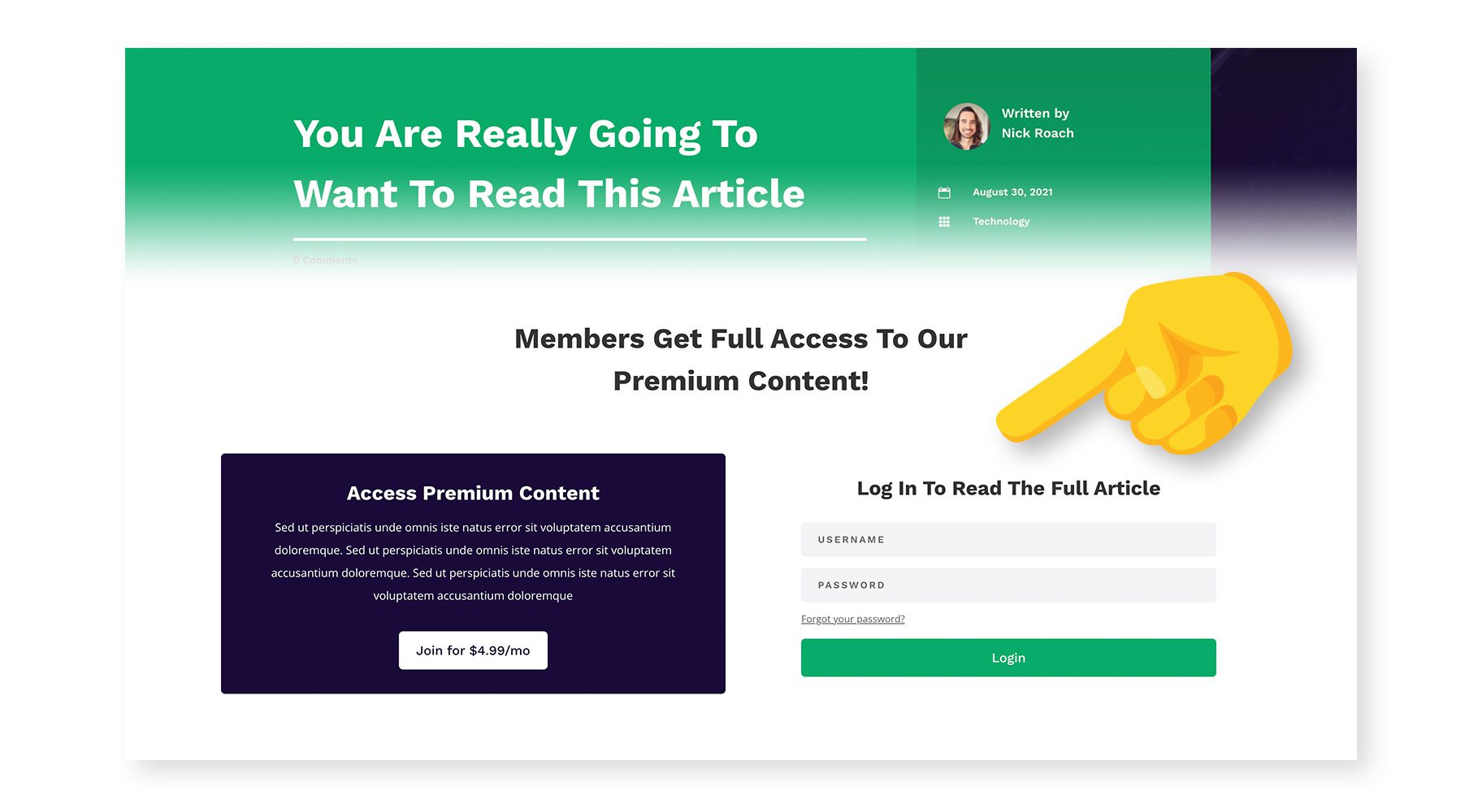 Diviβs condition options can be used to display specific content to logged-in users. In this example, I am building a website for an ad-free publication that is supported by paying customers who get exclusive access to certain articles. We need to display the full article to only paying subscribers. Everyone else will get a preview and the option to join. You have probably seen websites like this before, and we can recreate it easily in Divi!