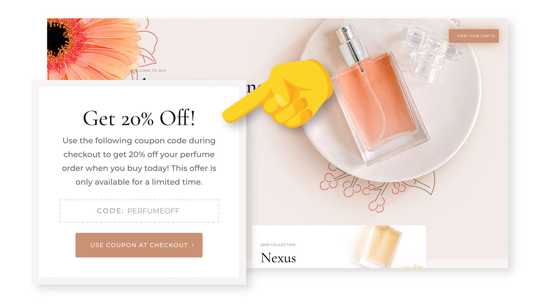 Now, when someone adds products to their cart, goes to check out, but gets cold feet before paying, the next time they visit the website theyβll see this 20% off coupon code, and I bet that will seal the deal!