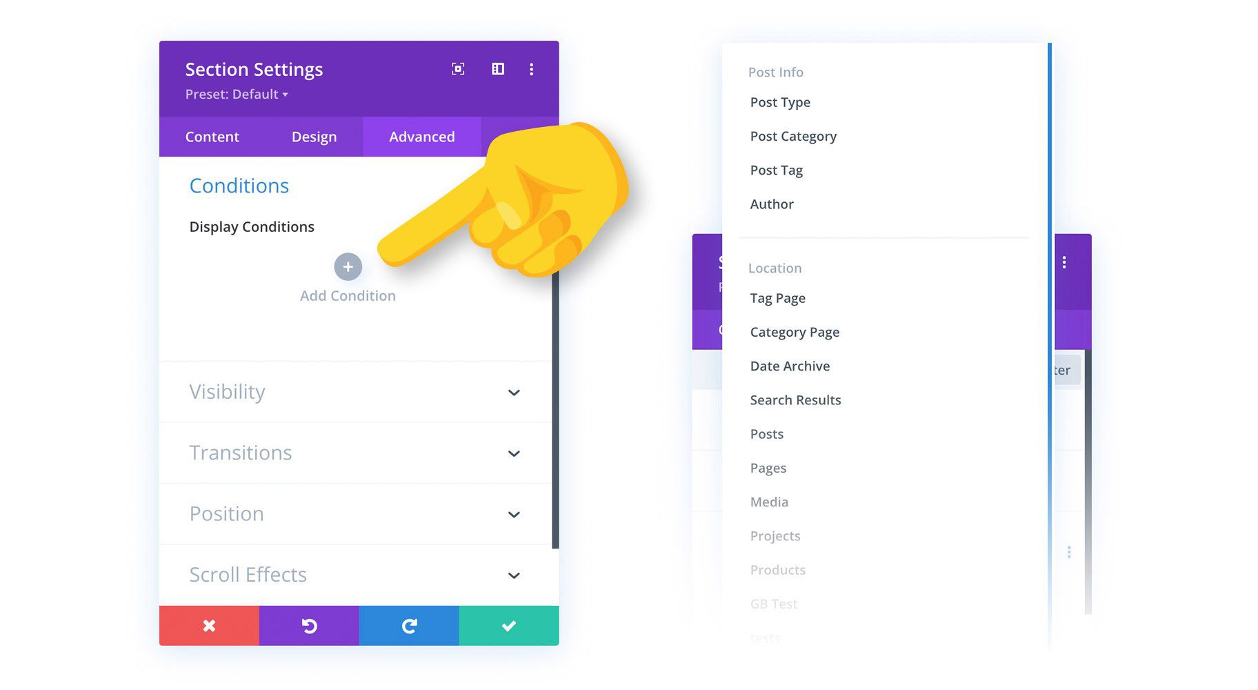 Divi comes with tons of condition options to choose from. Furthermore, each condition contains different sub-options that expand the scope of the condition for different scenarios. These conditions can also be combined to create advanced visibility rulesets.