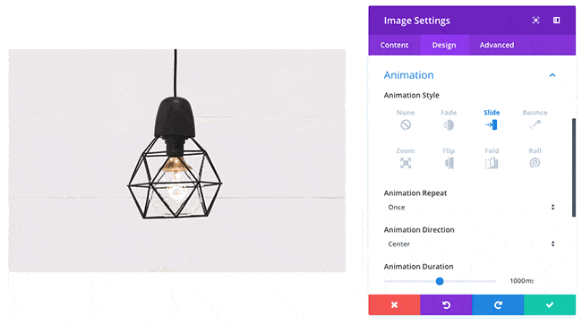 • Animation Intensity – When you adjust the intensity of an animation, it effects how drastic the movement of the item is during the animation. Divi does all the complicated math in the background for you. All you need to do is increase the slider to make your animations more snappy, or decrease the slider to make them more subtle!