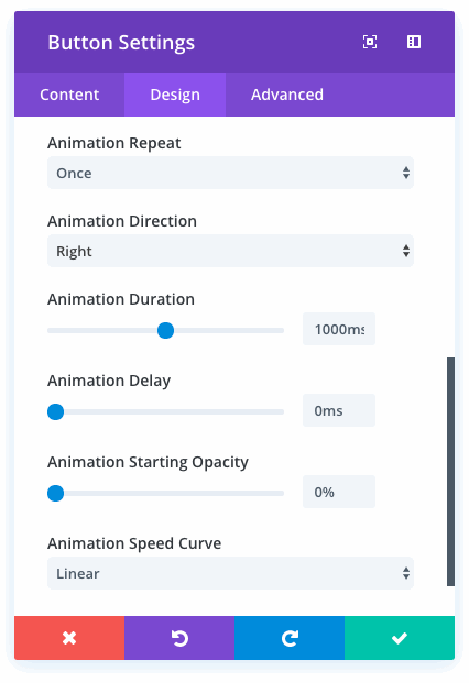 • Animation Starting Opacity – By default, all animations fade in from a starting opacity of 0. This can be adjusted to minimize or remove the fading effect.