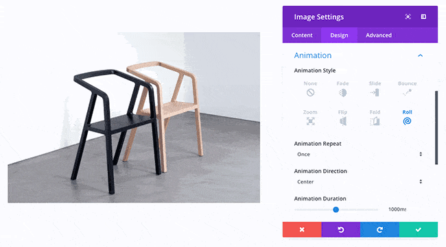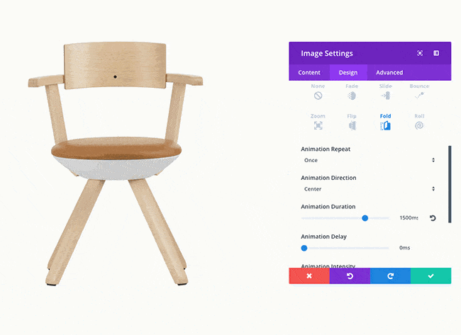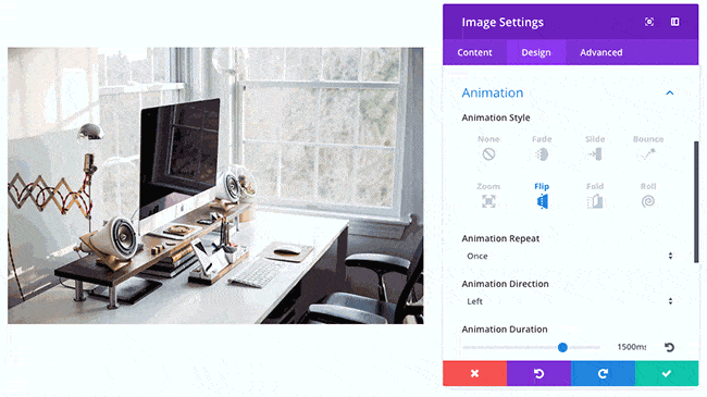 The new animation system comes with seven different animation styles, including Fade, Slide, Bounce, Zoom, Flip, Fold and Roll. Each different animation style creates a unique effect that can be used for different types of content and each style can be highly customized using our advanced animation controls. You can make your animations fast and snappy or slow and subtle, adjust the timing, add delay, change the direction and build the perfect set of animations for your page.